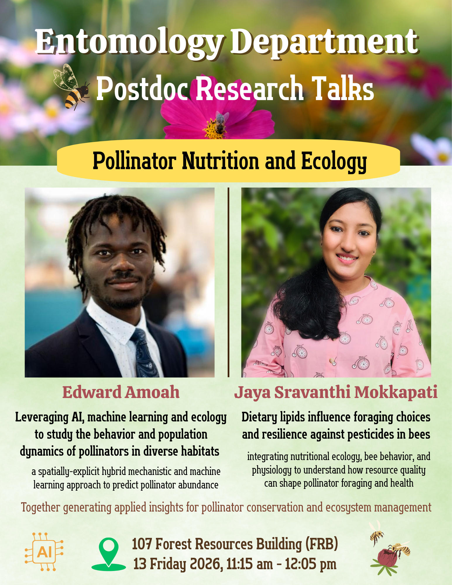 - Please join us as Jaya Sravanthi Mokkapati and Edward Amoah from the Grozinger Lab present their research on pollinator nutrition and ecology.