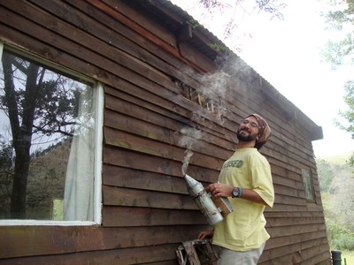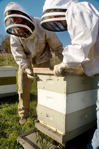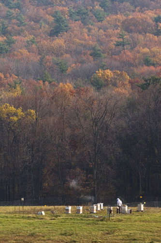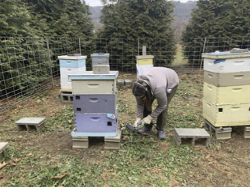 Kate Anton, Penn State Univ., administering OAV to colonies in one of our Nittany Valley apiaries
