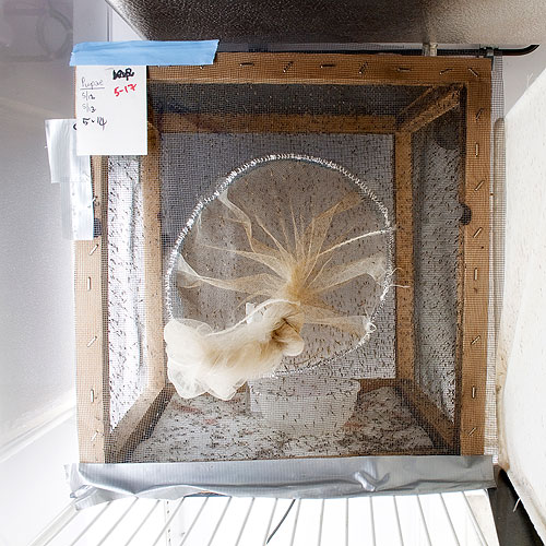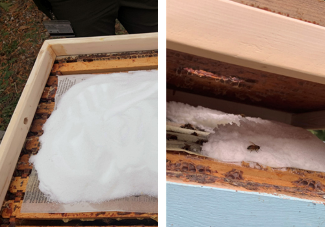 This figure shows the Mountain Camp method of providing supplemental sugar before (left) and after (right) bees have fed on it.