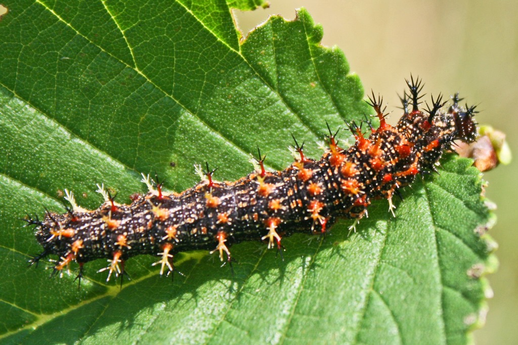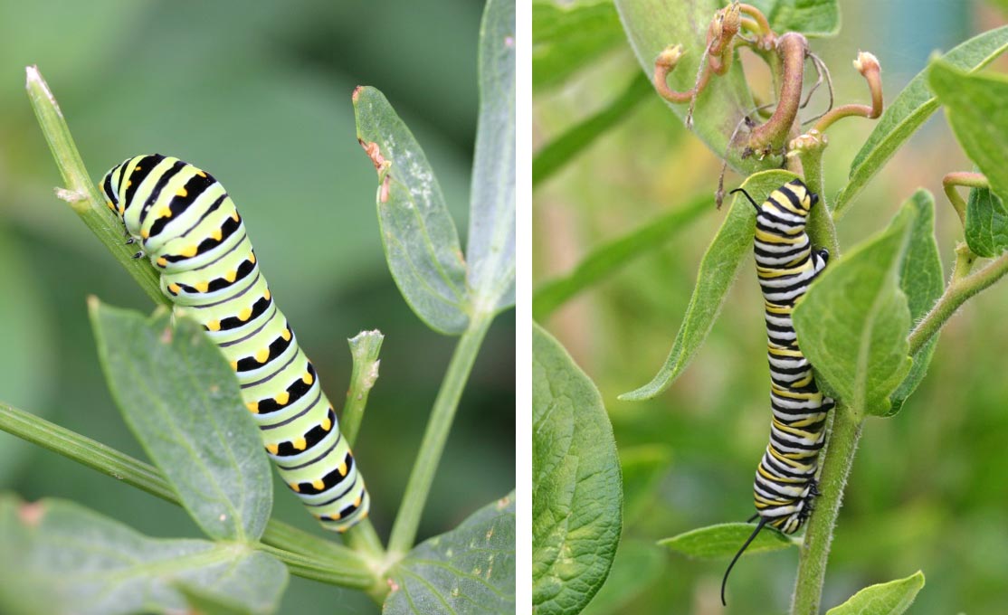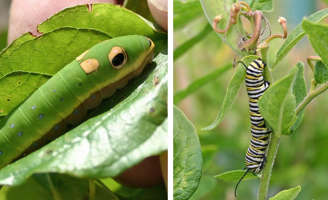 (Left) Spicebush swallowtail caterpillar feeding on spicebush (Right) Monarch caterpillar feeding on milkweed
