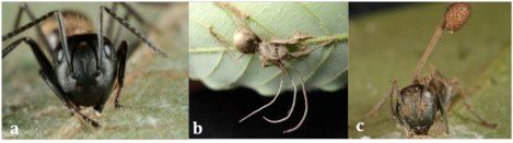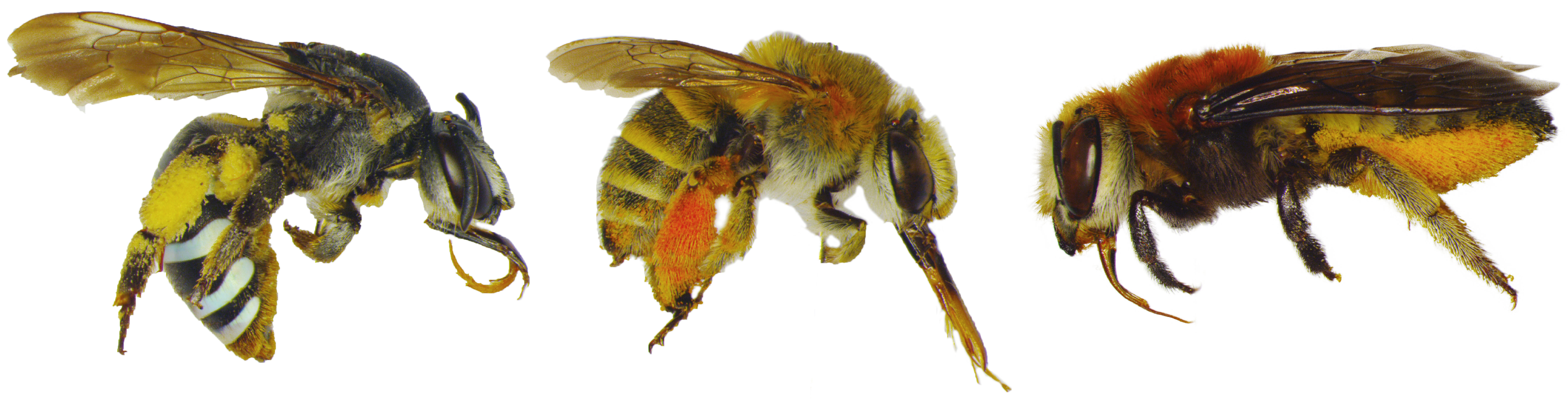 Females of most bee species have specialized pollen collecting hairs on their legs or underneath their abdomen to carry pollen from flowers to their nest. The different pollen species (note the different colors) collected by these bee species likely differ in protein:lipid ratios (P:L) that they are adapted to eat. Bee species: L - Nomia amabilis collected on Rafnia elliptica; M – Megchile discolor collected on Acacia karoo and Grewia robusta; R – Amegilla aspergina collected on Morea inclanata. Photos by Anthony Vaudo