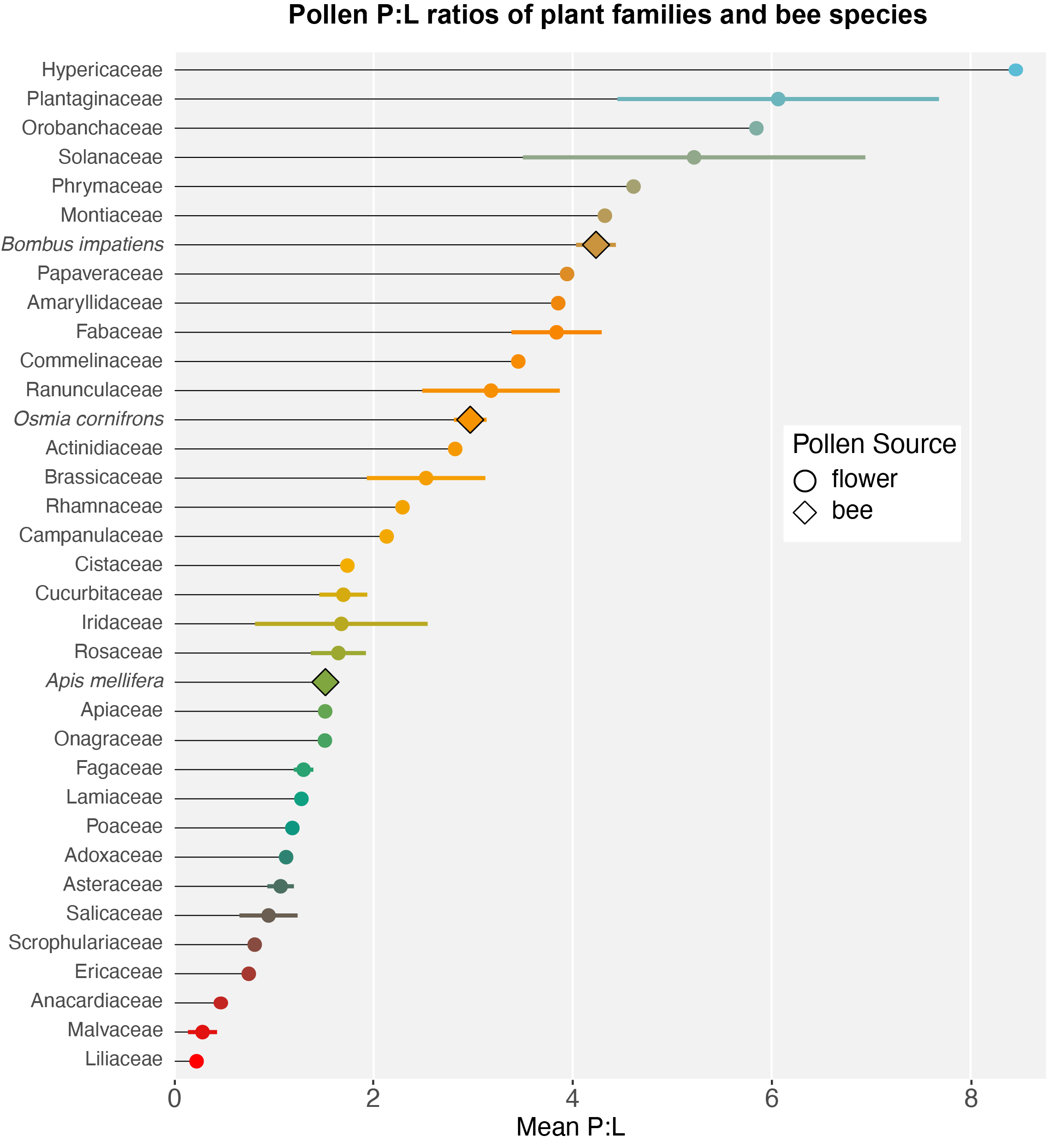 Plant family and bee species average P:L values. Circles represent plant families, and diamonds represent bee species. Note how the bee species differ in P:L values of the pollen collected. This may be because they have different nutritional preferences and therefore differentially collect pollen from locally available flowers to balance their diet.