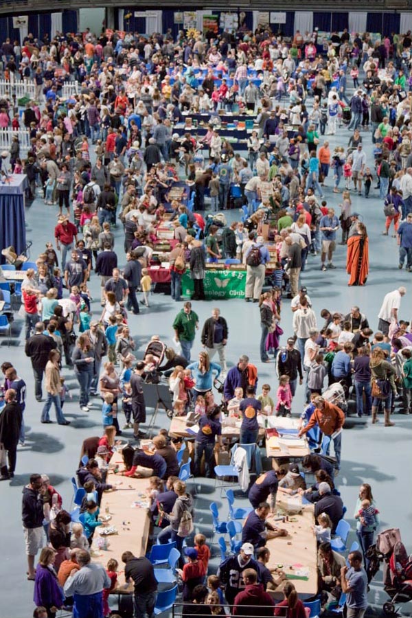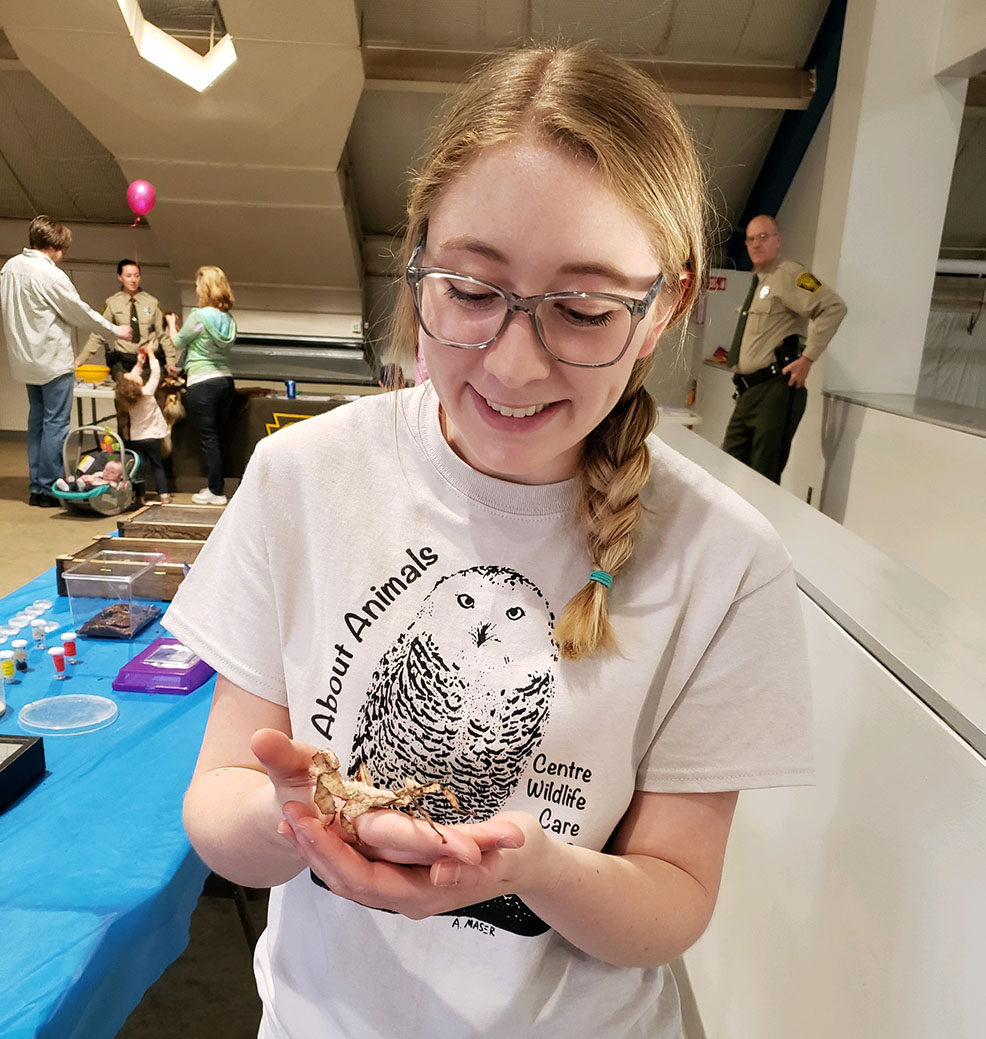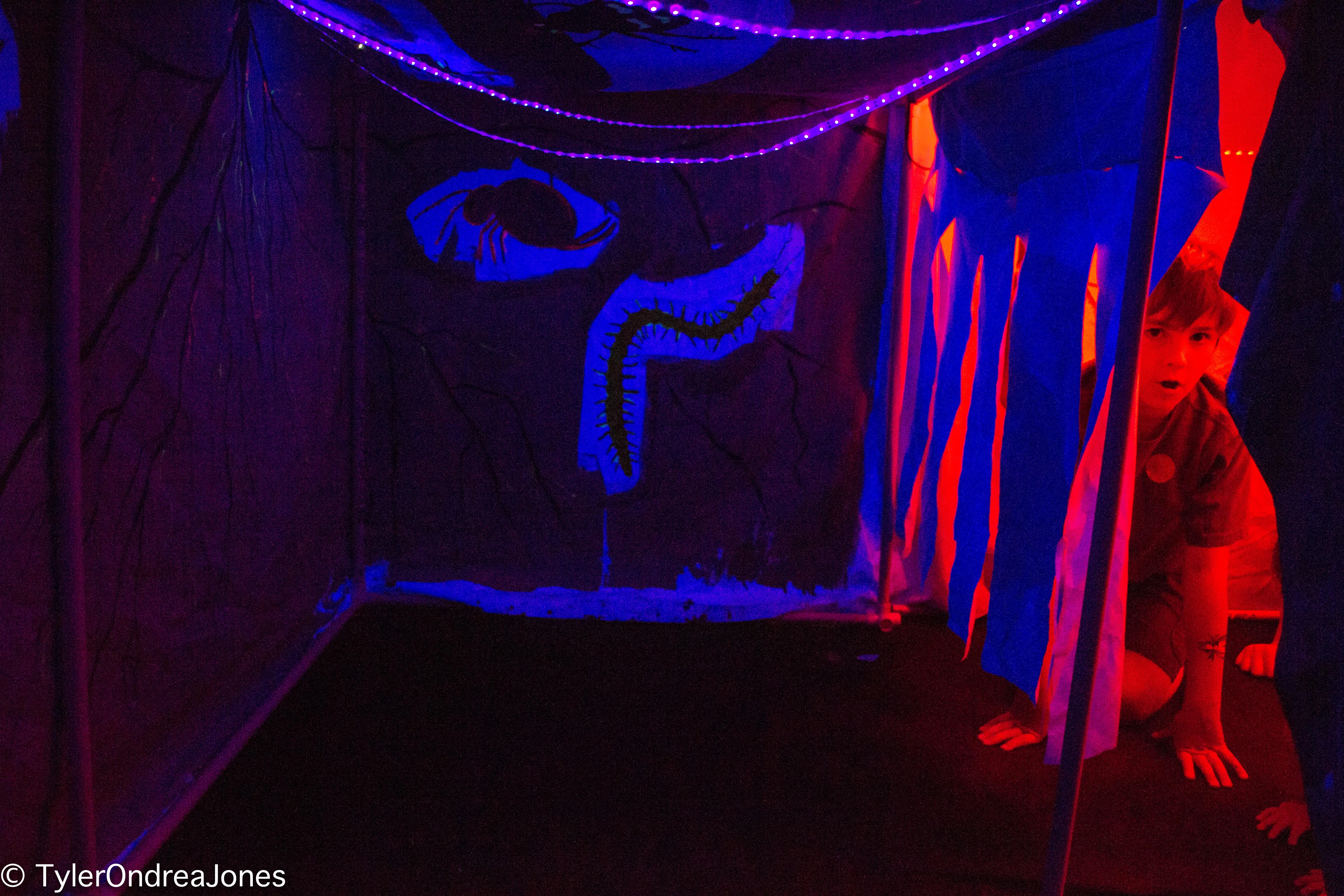 Inside the Haunted Soils. A 2019 PSU Great Insect Fair participant can be seen crawling through the tunnels. They are about to uncover a glow-in-the-dark collembollan and centipede.