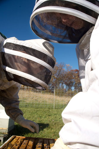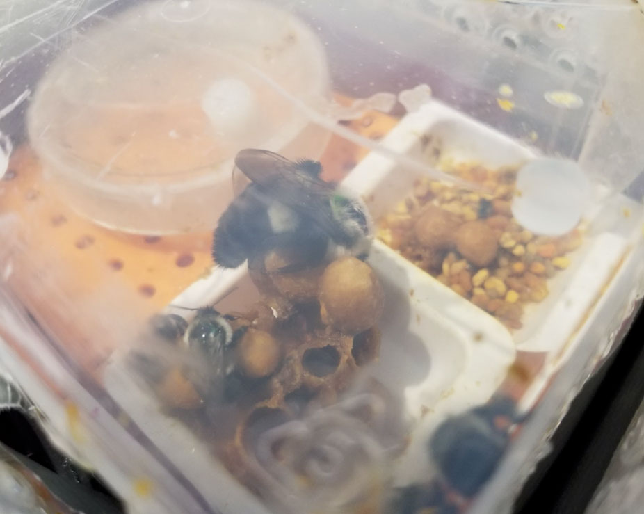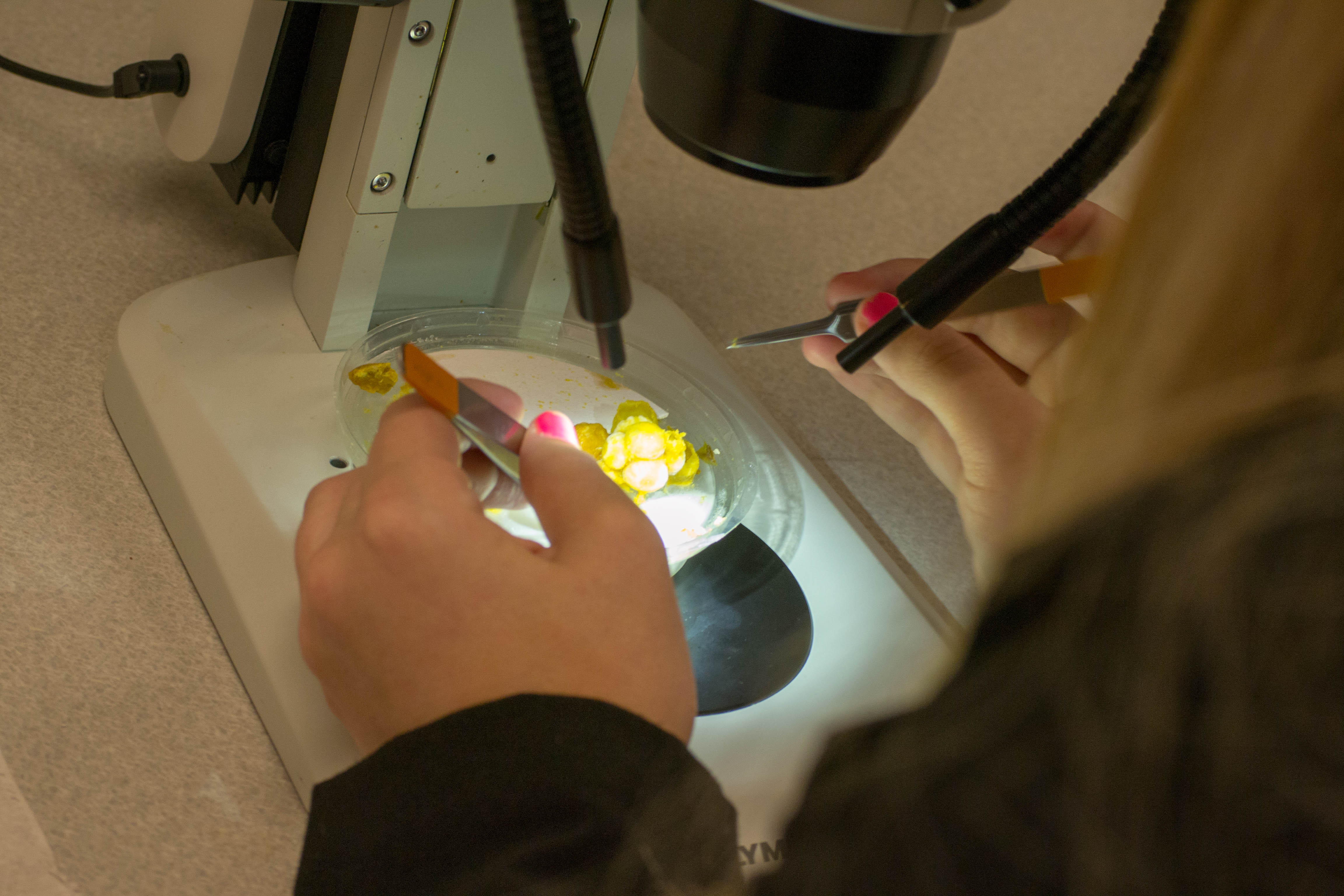 Rising junior, Jacklyn Kiner dissecting a bumble bee microcolony. She is investigating the role of nutrition on bumble queen reproduction.