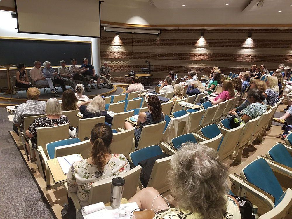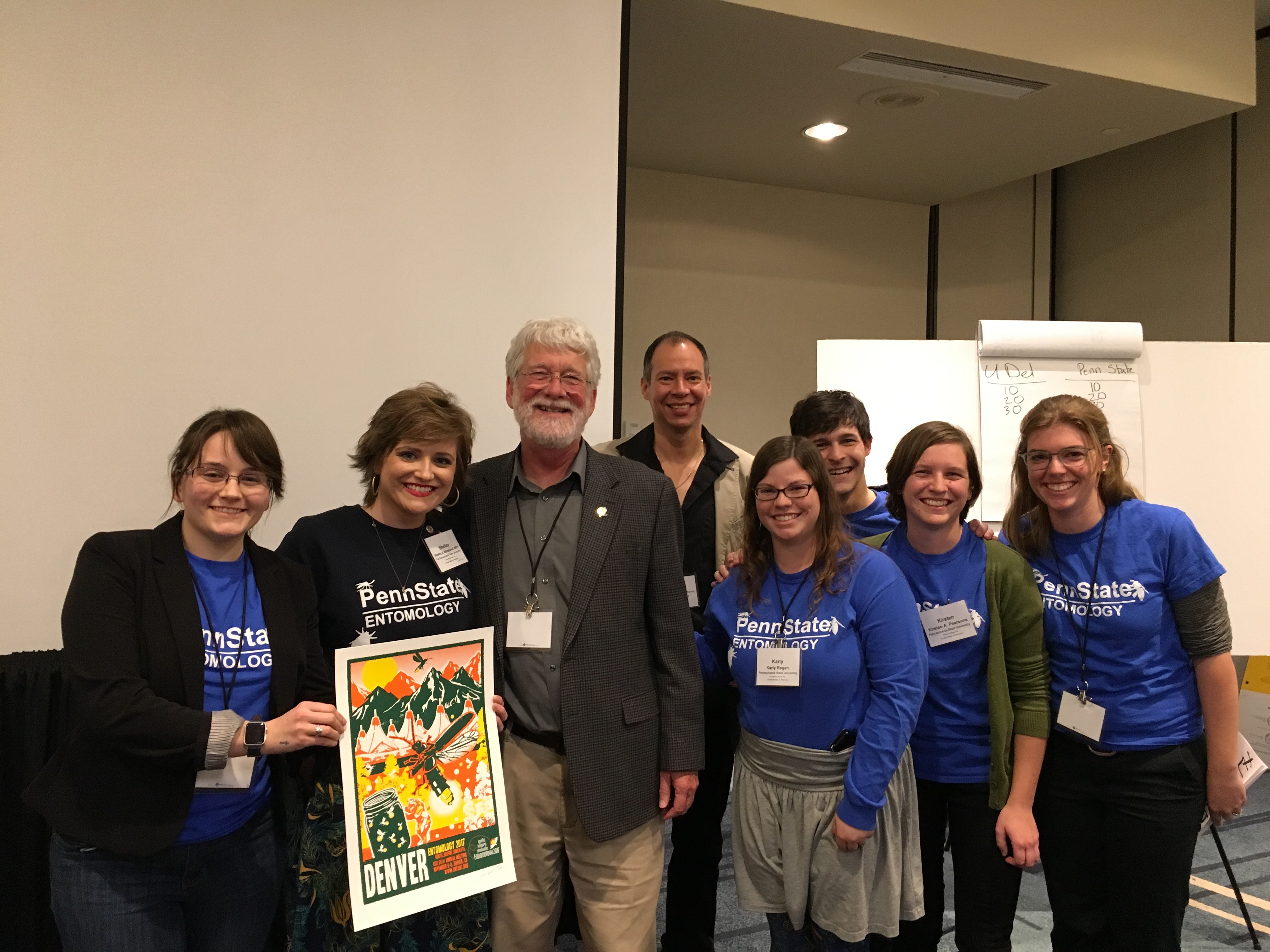 Panel discussion on the status of pollinators and bees, including factors that stress their populations. From left to right, Margarita López-Uribe, Harland Patch, Diana Cox-Foster, Jim Cane, Scott McArt, David Biddinger, and Shelby Flesicher. Photo by Shelby Kilpatrick.