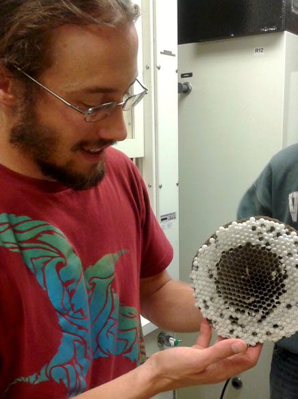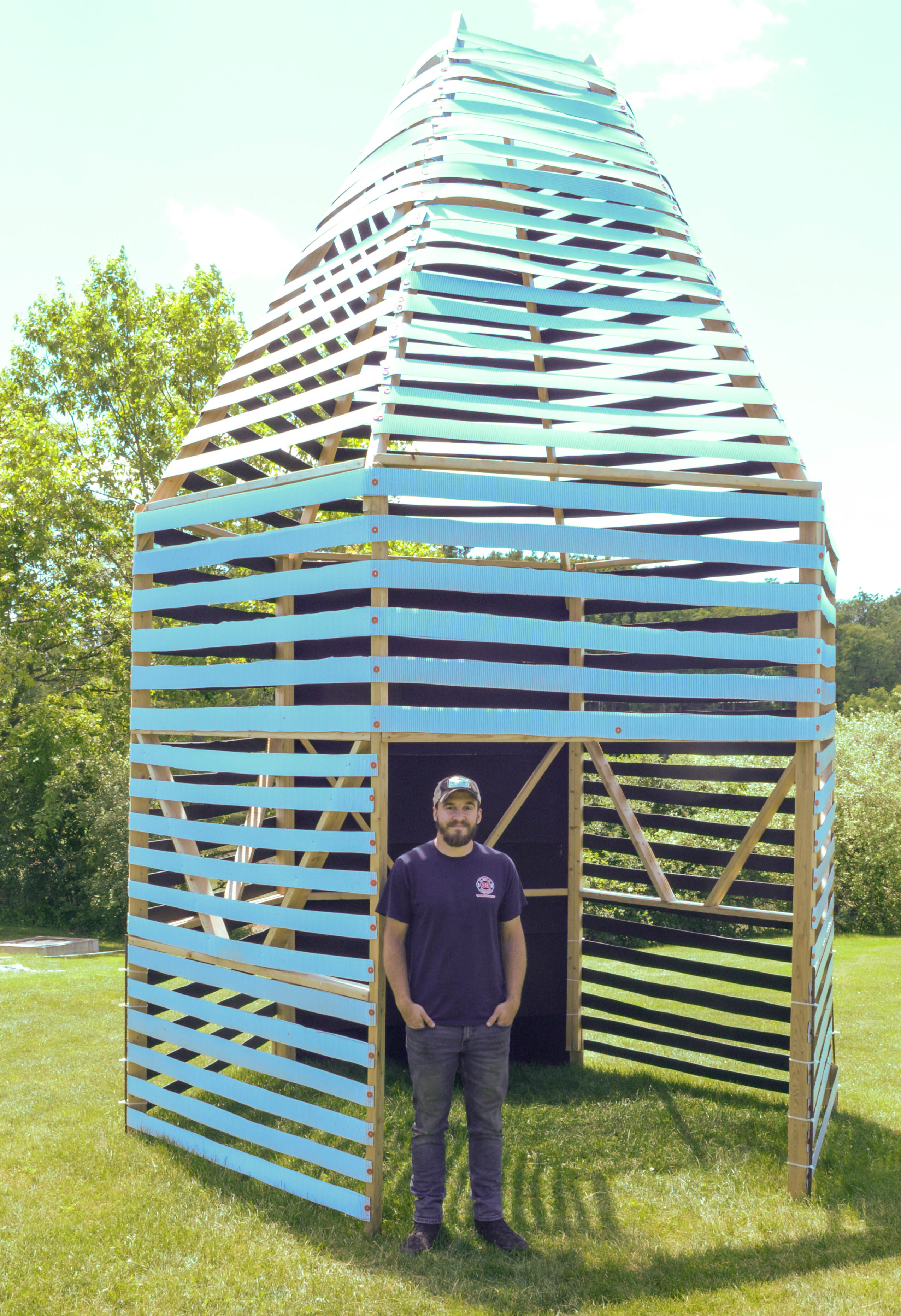 Rising senior, Matthew Poorman stands next to the 18-foot prototype “Bee Hut.” The pavilion design is modelled after old skeps, which were baskets used to house honey bees before Langstroth hives.