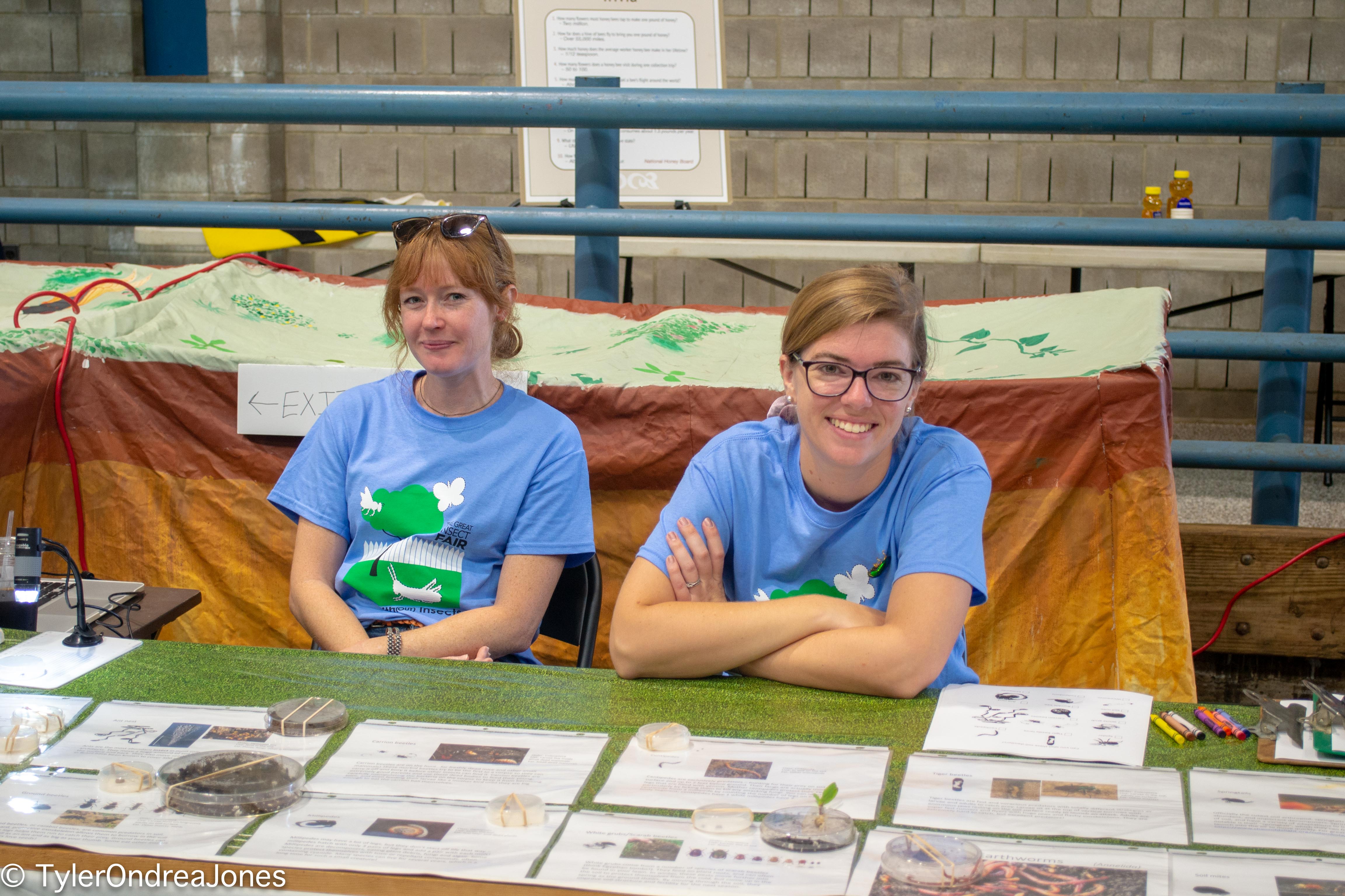 PSU Graduate students Elizabeth Rowen (right) and Liz Davidson-Lowe (left) sitting outside of the “Haunted Soils” Exhibit at the 2019 Great Insect Fair.