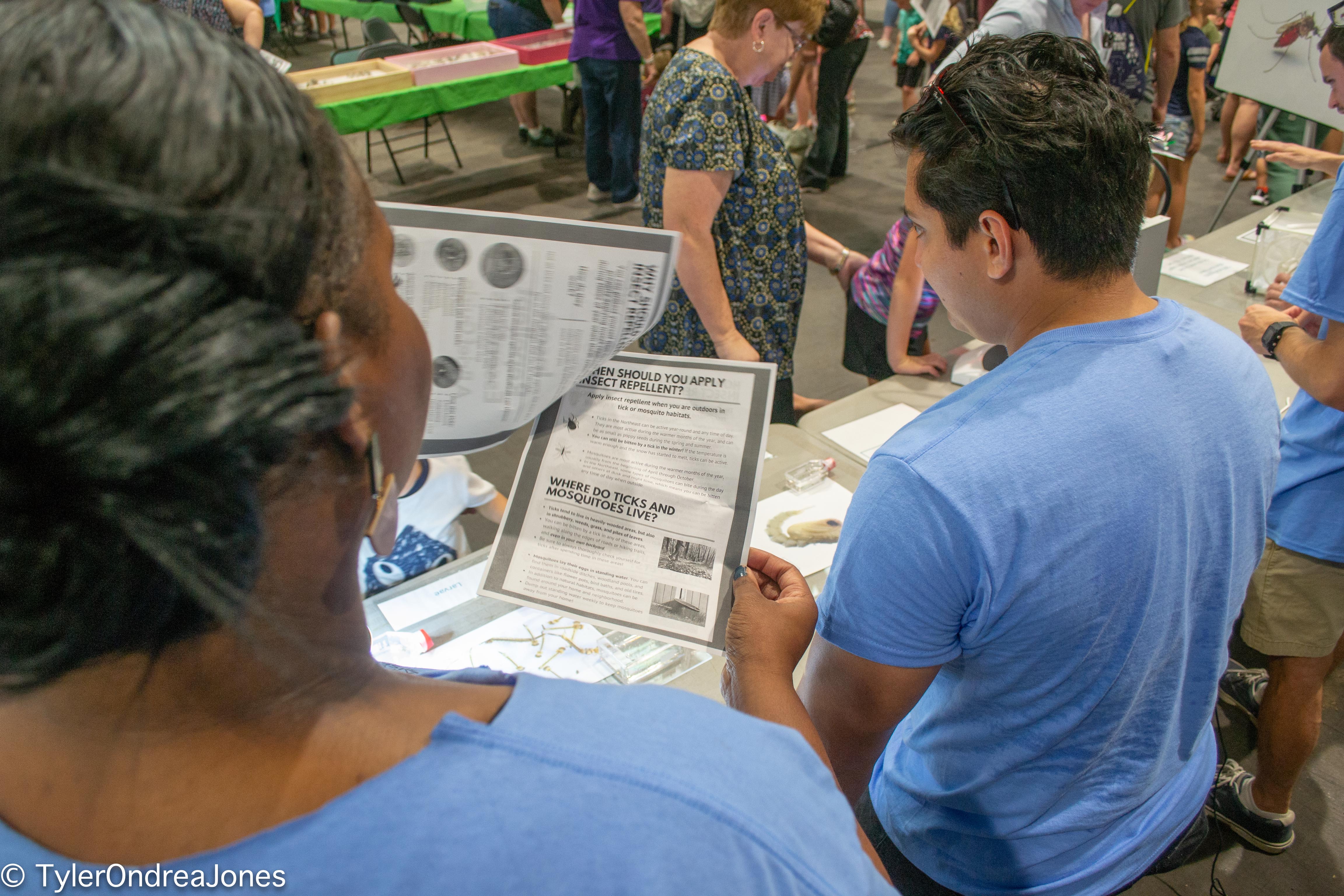 PSU Graduate students Fhallon Ware-Gilmore (left) and Mario Novelo Canto (right) heading the “Mosquito Biology” booth at the 2019 PSu Great Insect Fair. Ware-Gilmore can be seen flipping through a fact sheet on vector control that includes updated information on mosquito-vectored diseases and how to prevent them.