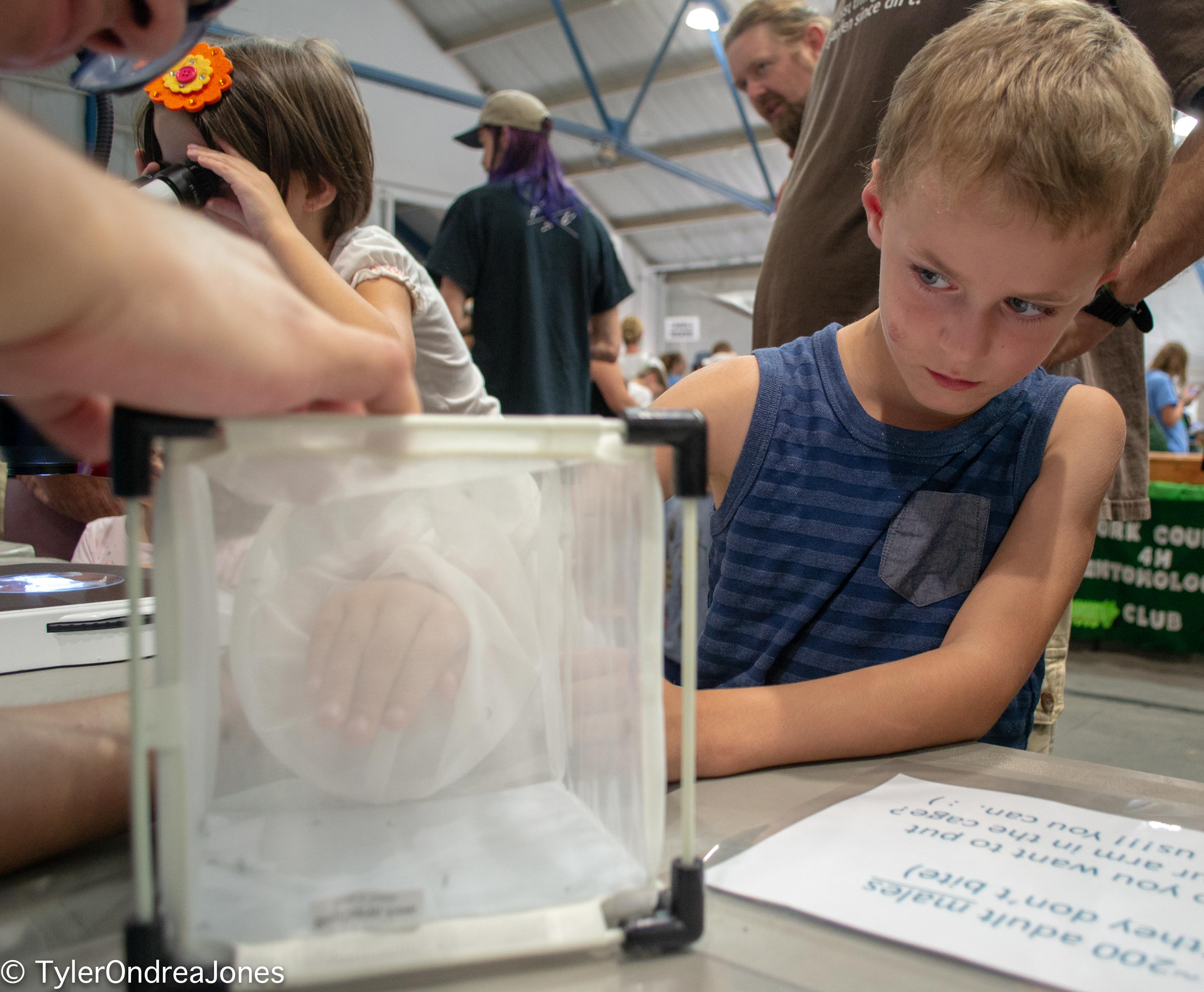 Young Great Insect Fair participant tests whether male mosquitoes really don’t bite. Spoiler Alert: they do not.