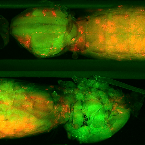 The researchers examined mosquitoes thirty days after they were infected with Wolbachia using whole mount fluorescence in situ hybridization. Wolbachia bacteria, indicated in red, are distributed throughout the mosquito. The green areas represent mosquito cell nuclei. Credit: Grant Hughes, Penn State